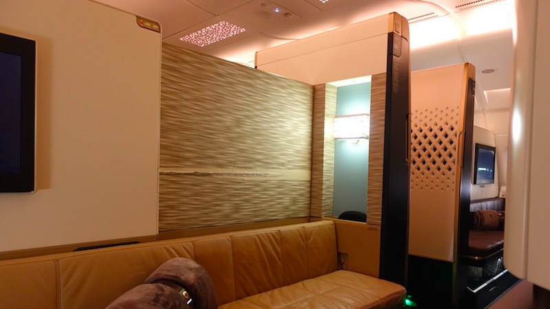 座位已经变成床了, 跟一般不同的是Etihad的A380是直接用座位前面的Sofa变成床, 其他的大部分都是直接从座位变成床, 所以就算你不想躺着看电视, 也可以回到座位上, 荧幕是可以转动的, 所以坐着还是躺着都能享受机上的娱乐系统.
